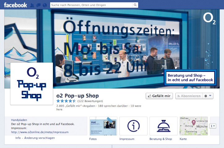 Einen anderen und durchaus innovativen Weg beschreitet seit einiger Zeit O2. O2 betreibt seit Ende November einen interaktiven Shop per Facebook Fanpage. Hier kann der Kunde sich sowohl über o2 Produkte beraten lassen, als auch gleich richtig shoppen. Zudem existiert der neue O2 Facebook Pop Up Store nicht nur virtuell auf Facebook, sondern hat auch ein real existierendes Pendant im O2 Tower in München. Der O2 Facebook Store ist also quasi mit dem Shop im O2 Tower verlinkt.
