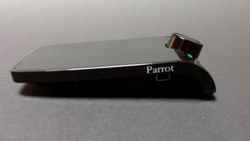 Das Parrot Minikit+ ist 11cm x 6cm groß und an seiner dicksten Stelle knapp 3cm hoch. An der Kopfseite befindet sich das Mikrofon, ein kombiniertes Kontrollrad/Knopf – Element und zwei Taster zum Ein/Aus Schalten bzw annehmen und ablehnen von Telefongesprächen. Davon abgesehen nimmt ein Flat-Lautsprecher den Großteil der Oberfläche des Parrot Minikit+ ein.