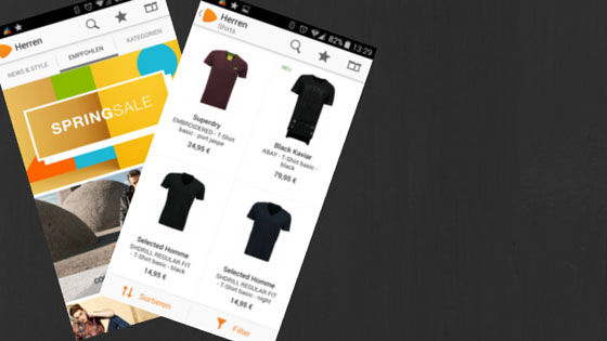 Die optisch durchaus gelungene App begrüsst einem nach dem Start großflächig mit einer Übersicht verschiedener Modethemen. Dies sind zum Beispiel „Die Neuheiten der Woche“ oder zum Zeitpunkt des Tests „Klassiker in neuen Formen“ und die Promotion eines „Springsales“. Natürlich erscheinen die Themen jeweils unterschiedlich für Damen, Herren und Kinder. Gezielter nach Kleidungsstücken suchen lässt sich allerdings, wenn man die entsprechenden Kategorien wählt. Diese sind wie üblich eingeteilt: Schuhe, Bekleidung, Sport, Accessoires usw, welche dann jeweils noch in passende Unterkategorien unterteilt sind.