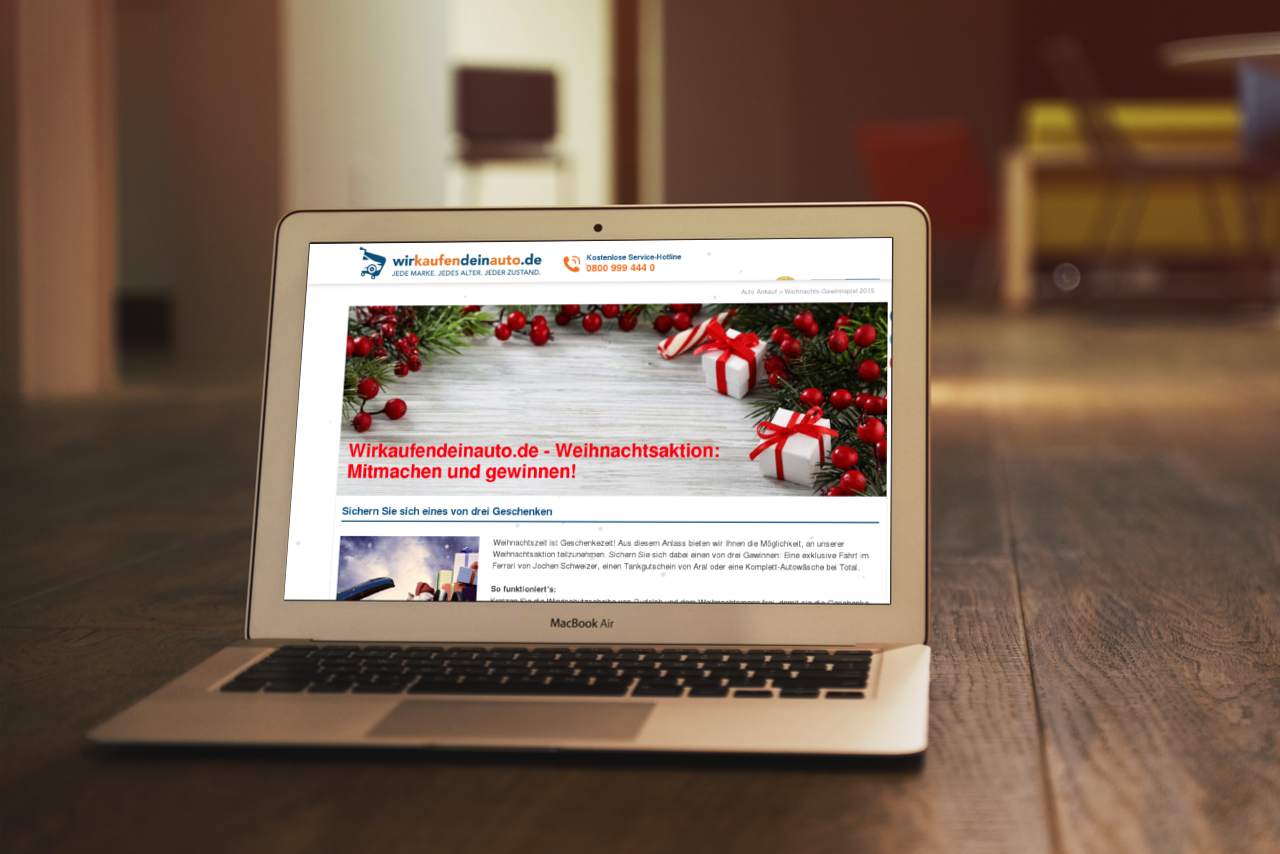 Die Aufgabe, die wirkaufendeinauto.de stellt, erweist sich als wesentlich drolliger. Denn hier sitzen der Weihnachtsmann und Rudolph das Rentier gemeinsam in einem Auto und wollen Geschenke ausliefern. Damit sie das auch sicher machen können, muss man ihnen zunächst die Frontscheibe des Autos frei kratzen. Das war es schon. Ist die Scheibe frei, kann man am Gewinnspiel teilnehmen und hat die Chance einen von drei Gewinnen einzustecken.