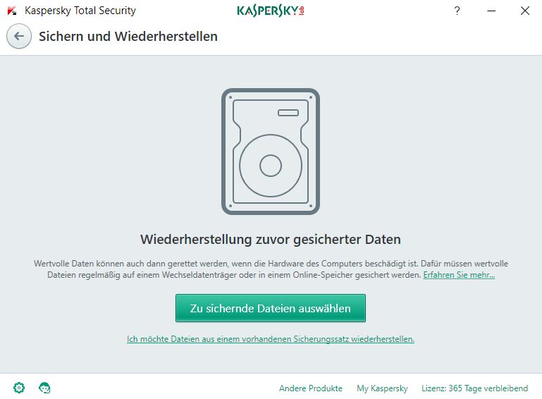 Und wenn doch mal irgendetwas schief gehen sollte und sei es nur, dass man aus Unachtsamkeit ungewollt etwas gelöscht hat, ist es mit Kaspersky Total Security möglich Backups von wichtigen Daten, Bilder oder auch Musikdateien anzulegen. Die Software speichert diese dann in verschlüsselter Form auf der Festplatte. Dies ist eine Funktion deren Wichtigkeit man nicht unterschätzen sollte. Denn selbst wenn nur die Bilder des letzten Urlaubes verloren gehen, ist das für viele verständlicherweise sicher mehr als nur ärgerlich. Ist allerdings ein Backup vorhanden, dann lassen sich diese Erinnerungen einfach wiederherstellen.