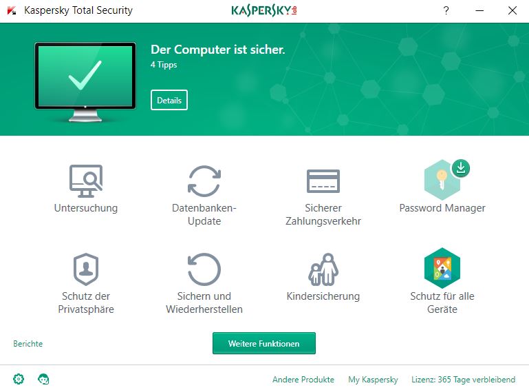 Kaspersky Total Security 2018 ist eine sehr umfangreiche Sicherheitslösung für den Privatanwender. Die Software bietet zum Beispiel mit dem Kinderschutz, dem Passwort Manager und der Absicherung des Online Bankings Funktionen, die viele andere einfache Antivirusprogramme und Sicherheitslösungen nicht bieten. Dennoch bleibt die Software auch für den Laien einfach, auch in Bezug auf die schnelle und unkomplizierte Installation, zu bedienen. Und bietet somit einfachen Schutz auf PC, Mac, Android oder iPhone. Installieren und das Gerät ist sicher.